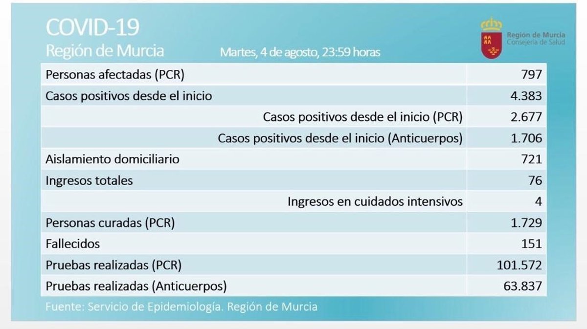 El número de afectados total en la Región de Murcia desde el inicio del brote de esta pandemia asciende a 4.383 personas, de los que 2.677 casos han sido acreditados mediante PCR (65 más que el día anterior), según los datos del Servicio de Epidemiología de el martes a las 23.59 horas.