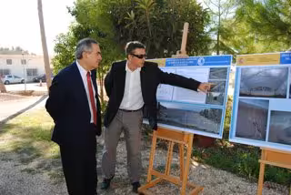 El delegado del Gobierno en la Región de Murcia, Rafael González Tovar, y el director de la Mancomunidad de Canales del Taibilla, Andrés Martínez Francés, han visitado las obras de reparación del depósito de reserva de agua de Lorca, que quedó afectado por los terremotos del pasado 11 de mayo y en el que se está realizando una inversión de 2,3 millones de euros.
