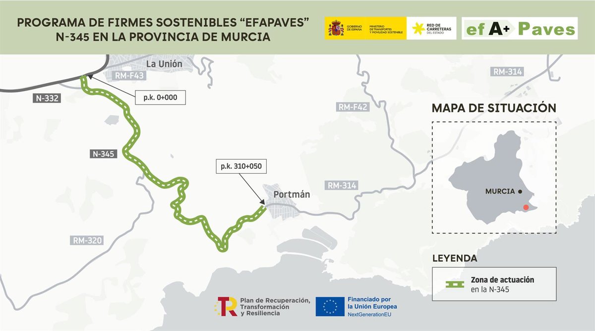 La primera fase de los trabajos se localizará en la N-345, entre los puntos kilométricos 0 y 7,1, a su paso por el término municipal de La Unión.