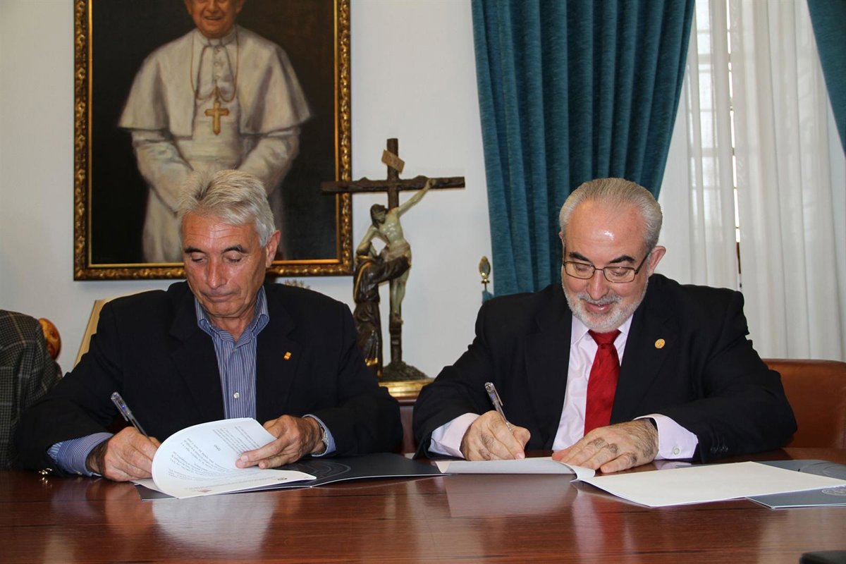 El acuerdo está orientado desde el punto de vista académico pero deja abierto el camino para la colaboración en materia de competiciones. José Luis Mendoza, presidente de la UCAM, y Antonio García, presidente de la FTRM, han firmado el convenio.