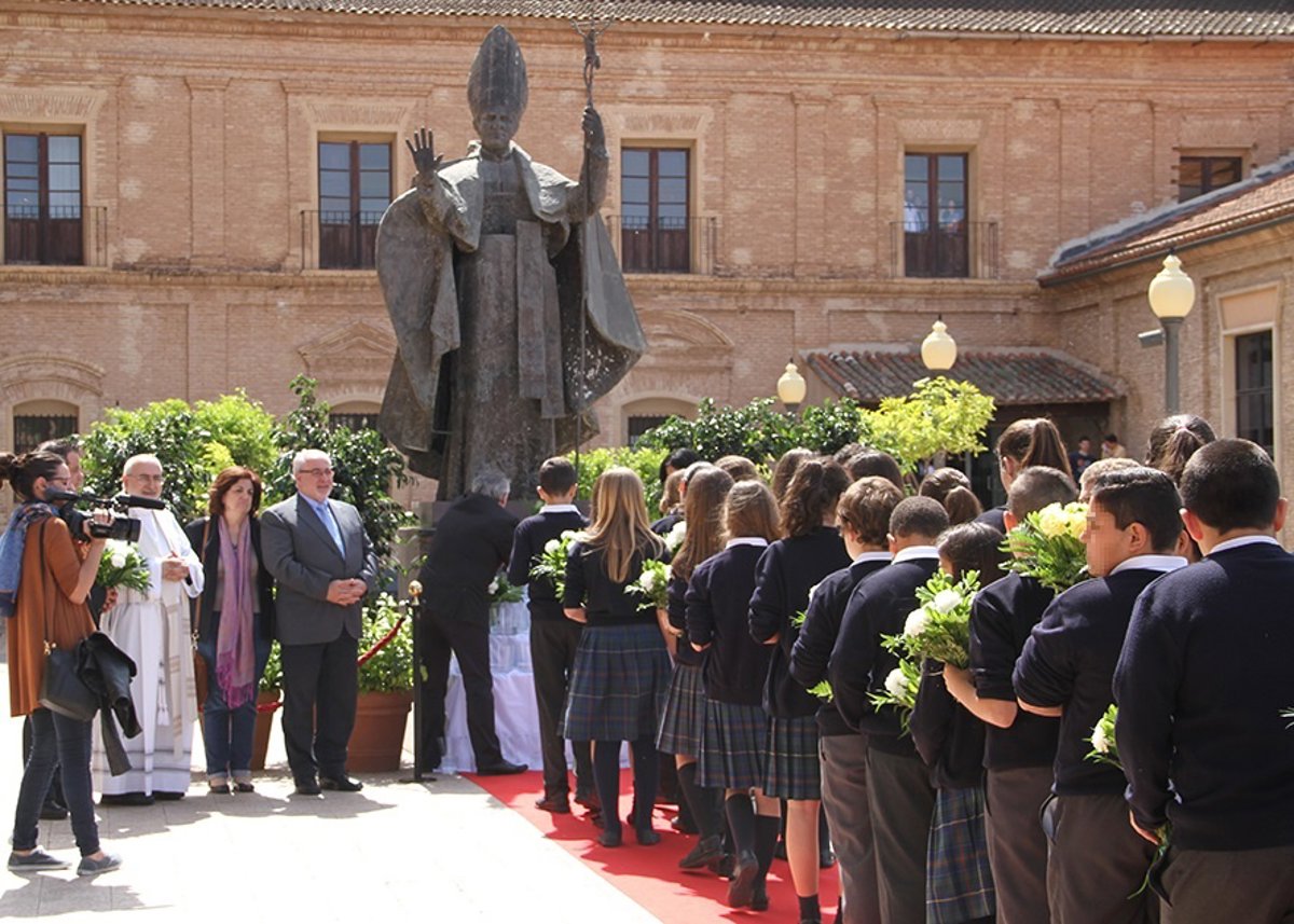 Además, a continuación un grupo de alumnos del colegio San Vicente de Paul (El Palmar) han realizado una ofrenda floral a la escultura de San Juan Pablo II ubicada en el Campus de Los Jerónimos.