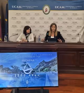 En la UCAM tenemos las disciplinas que están ligadas a lo que puede ser el uso de estas aguas termales, como salud, turismo o economía", ha afirmado Estrella Núñez, vicerrectora de Investigación de la Universidad, quien también ha estado presente en el acto junto a los máximos responsables de las facultades de Medicina; Economía y Empresa; Farmacia y Nutrición; Fisioterapia, Podología y Terapia Ocupacional; Enfermería; Deporte, y de la Cátedra Internacional de Hidrología Médica e Hidroterapia.
