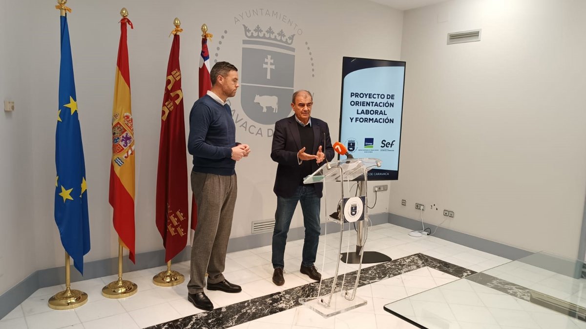 El presidente de Ucomur, Juan Antonio Pedreño, y el alcalde de Caravaca de la Cruz, José Francisco García, han presentado este lunes en el Ayuntamiento del municipio el proyecto formativo y de orientación laboral que la Unión de Cooperativas de Trabajo Asociado de la Región de Murcia ha puesto en marcha recientemente junto al Servicio de Empleo y Formación (SEF).