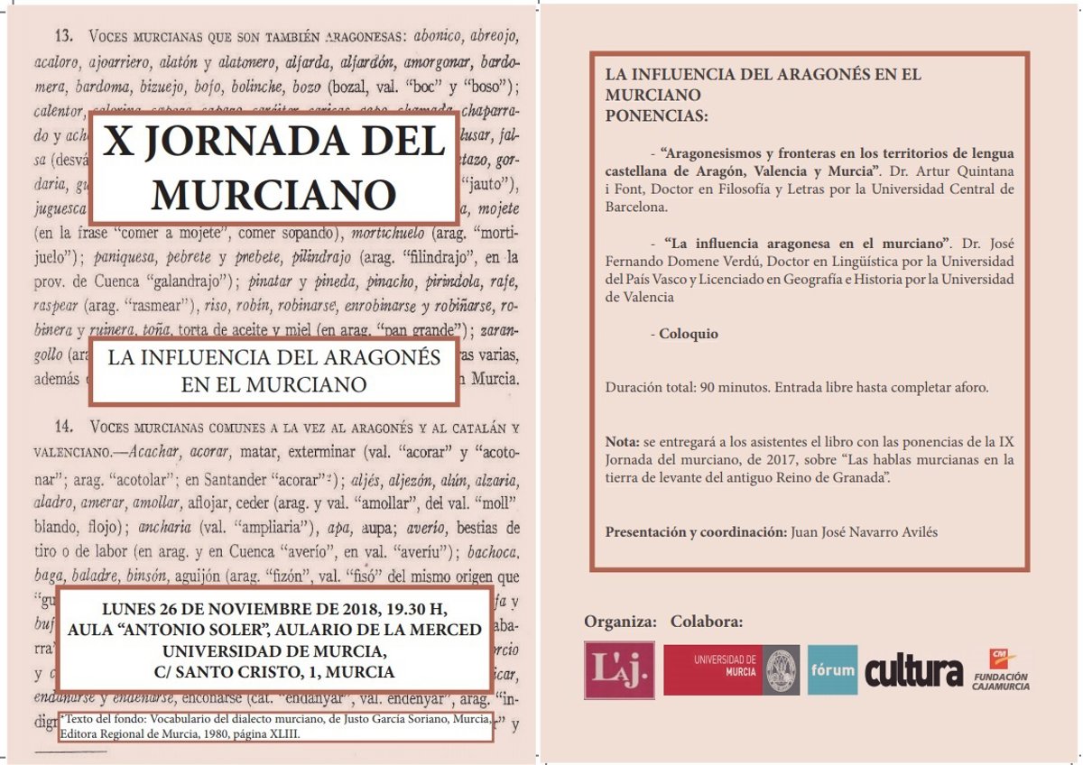 El aula 'Antonio Soler' del campus de la Merced de la Universidad de Murcia (UMU) acogerá el lunes, 26 de noviembre, una jornada que tratará sobre la influencia del aragonés en el dialecto murciano de la mano de dos prestigiosos doctores en Lingüística y en Filosofía y Letras.