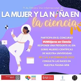 Con motivo de la conmemoración del Día Internacional de la Mujer y la Niña en la Ciencia (11 de febrero), desde el día 5 hasta el 8 de febrero de 2023 se posteará una pregunta diaria a través de todas las redes sociales de la UMU (@umu en Twitter e Instagram, @universidadmurcia en Facebook) sobre distintas investigadoras de la institución.