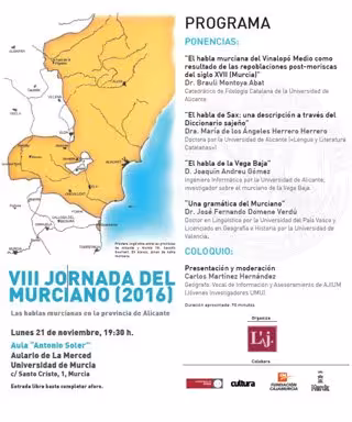 La Asociación Cultural L'Ajuntaera ha organizado, con el patrocino de la Universidad de Murcia, la VIII Jornada del Murciano, que se celebrará a partir de las 19.30 horas, en el Aula Rector Antonio Soler del Aulario de la Merced de la UMU (C/ Santo Cristo, 1) bajo el título 'Las hablas Murcianas en la provincia de Alicante'.