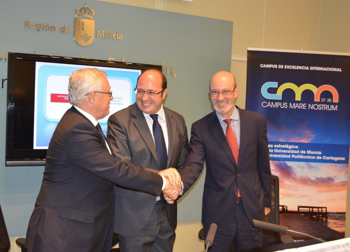 El consejero de Educación, Universidades y Empleo, Pedro Antonio Sánchez, presidió hoy la firma del acuerdo entre el rector de la Universidad de Murcia, José Antonio Cobacho, y el rector de la Universidad Politécnica de Cartagena, José Antonio Franco, para la creación de la llamada 'tarjeta interuniversitaria' para compartir servicios e instalaciones y optimizar los recursos públicos de ambas universidades.