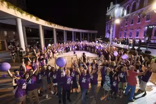 En total, más de 2.000 personas formaron un gran lazo humano de color violeta, ayudado por miles de globos y camisetas conmemorativas del acto. El lazo partió de La Merced y se extendió hasta la avenida Antonete Gálvez, informan fuentes de la UMU.