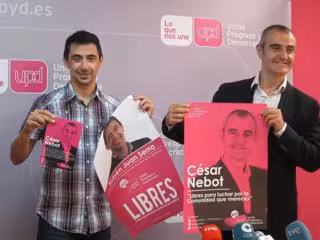 El candidato de Unión Progreso y Democracia a la presidencia de la Comunidad, César Nebot, junto al también candidato a la alcaldía de Murcia, Rubén Juan Serna, han explicado que el lema de campaña escogido por la formación magenta es 'Libres', "en relación a la autonomía del partido en defender los intereses de la gente".