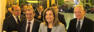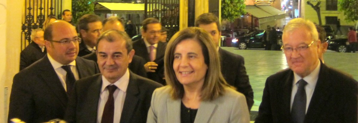 El presidente del Partido Popular y candidato al Parlamento Europeo, Ramón Luis Valcárcel, acompañado de la ministra de Empleo y Seguridad Social, Mª Fátima Bañez, presiden este miércoles el Foro 'Hablemos de Europa'.