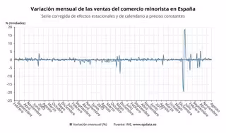 Variación mensual de las ventas del comercio minorista en España. Serie corregida de efectos estacionales y de calendario a precios constantes - INE, WWW.EPDATA.ES