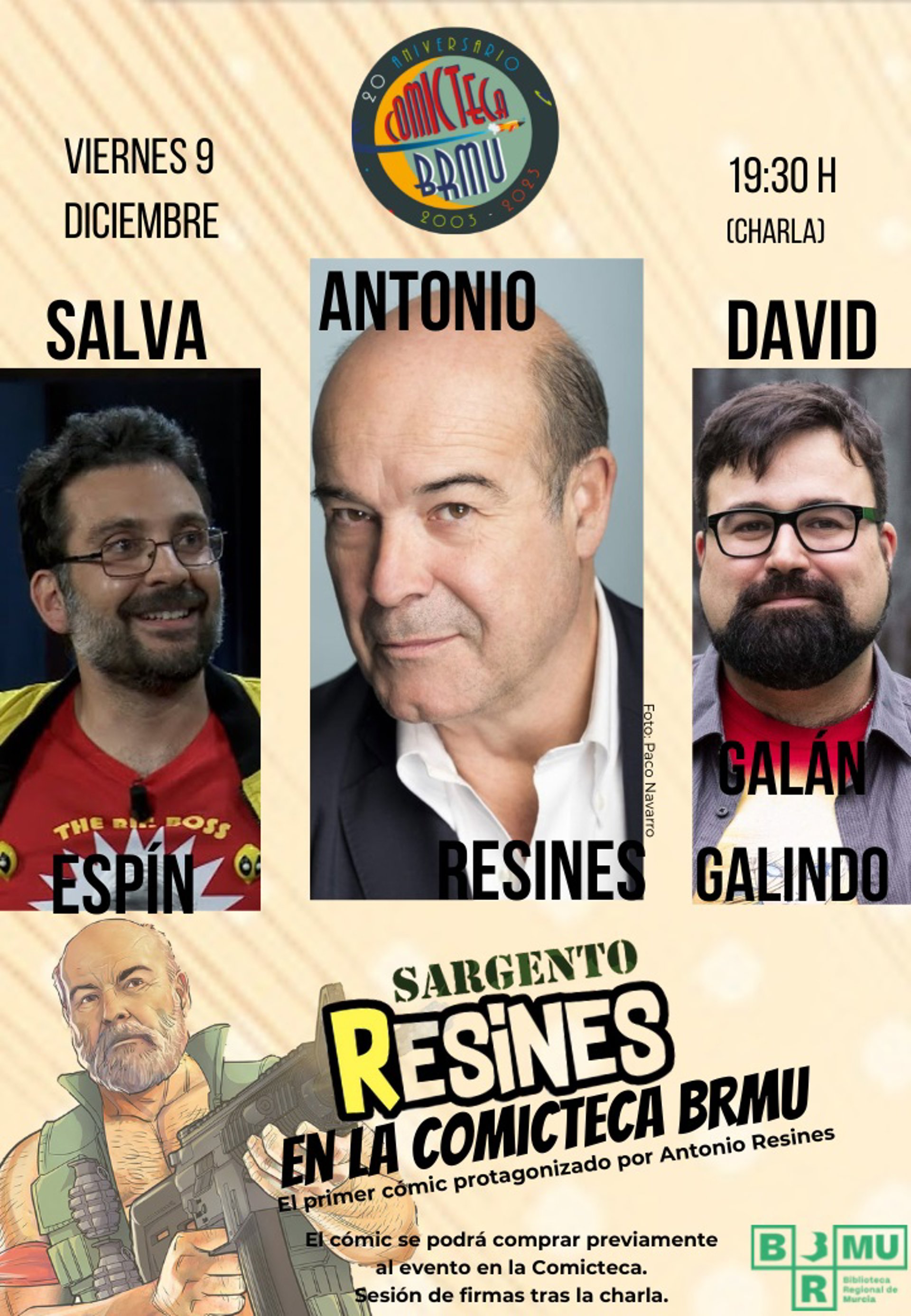 El evento 'Sargento Resines en la Comicteca' tendrá lugar el 9 de diciembre, a las 19.30 horas, y contará con la presencia del popular actor, acompañado por el artista murciano Salva Espín y el director de cine y escritor David Galán Galindo.