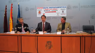 El delegado del Gobierno, Joaquín Bascuñana, ha presentado este viernes la XVIII Ruta Mototurística 'Por la Vida', que organiza la asociación Todos Contra la Droga, acompañado por su presidente, Casiano Navarro-Soto, quien ha destacado que este acontecimiento "es único" y supone, además, "mostrar la Región", así como por el director de la Ruta, Antonio Belmonte.