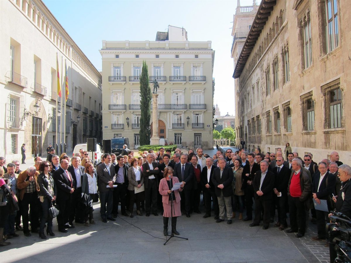 Un total de 147 alcaldes socialistas se han concentrado este viernes frente al Palau de la Generalitat para exigir al presidente Alberto Fabra "un calendario de pago realista y consensuado" para saldar la deuda de 2.000 millones que mantiene con el municipalismo valenciano y que hace "peligrar" los servicios que prestan los Ayuntamientos.
