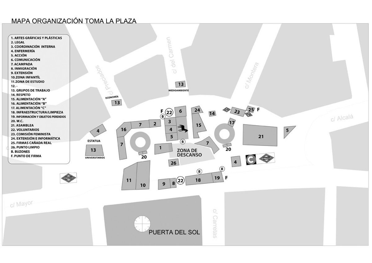 Los acampados ya realizaron ayer un 'mapa de organización' que distinguía las zonas de artes gráficas y plásticas, legal, coordinación interna, enfermería, acción, comunicación, acampada, inmigración, extensión, zona infantil, biblioteca o información electoral, entre otras.
