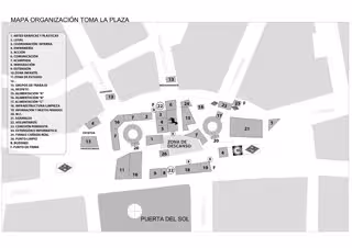 Según el mapa colgado en la web 'Tomalaplaza', hoy cambian de sitio algunos puntos como la zona de 'acción' o la 'enfermería' y surgen nuevas zonas como la 'comisión feminista', el grupo 'firmas Cañada Real', o más puntos de alimentación.