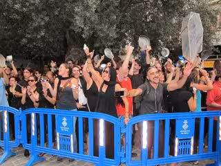 Tras la salida de Isern del Consistorio de Palma, varios simpatizantes del PP se asomaron al balcón del Ayuntamiento con banderas y gorros de este partido, lo que provocó que los 'indignados' empezaran a gritar 'queremos subir, queremos subir'.