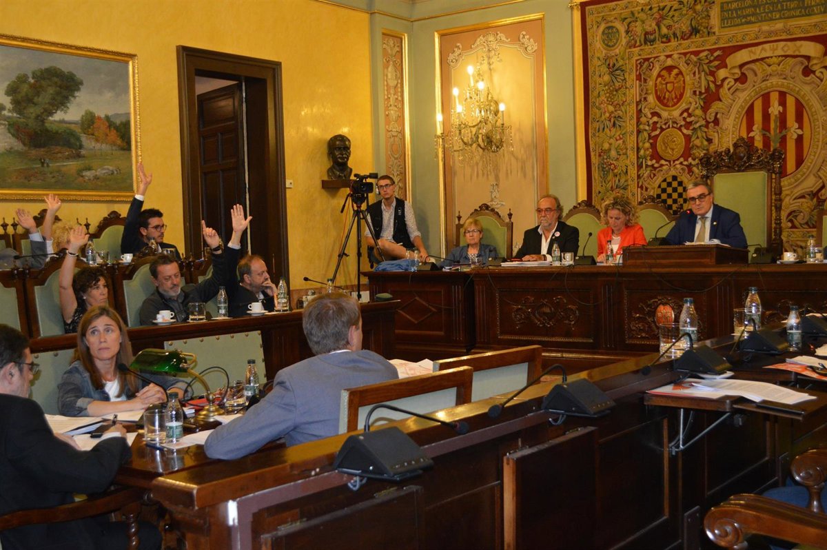 El salón de plenos se ha llenado de afiliados al PSC que apoyaban al alcalde y simpatizantes y afiliados de otros grupos, algunos con fotos de las cargas del domingo en la Escuela Oficial de Idiomas, uno de los colegios con más heridos.