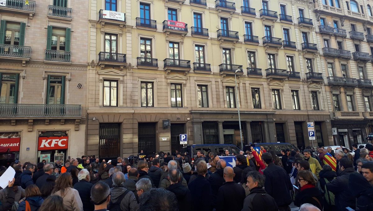 Los concentrados han cortado la Ronda Universitat, a la altura de Rambla Cataluña, donde se sitúa el consulado, custodiado por dos furgones de los Mossos d'Esquadra y una decena de agentes en la acera.