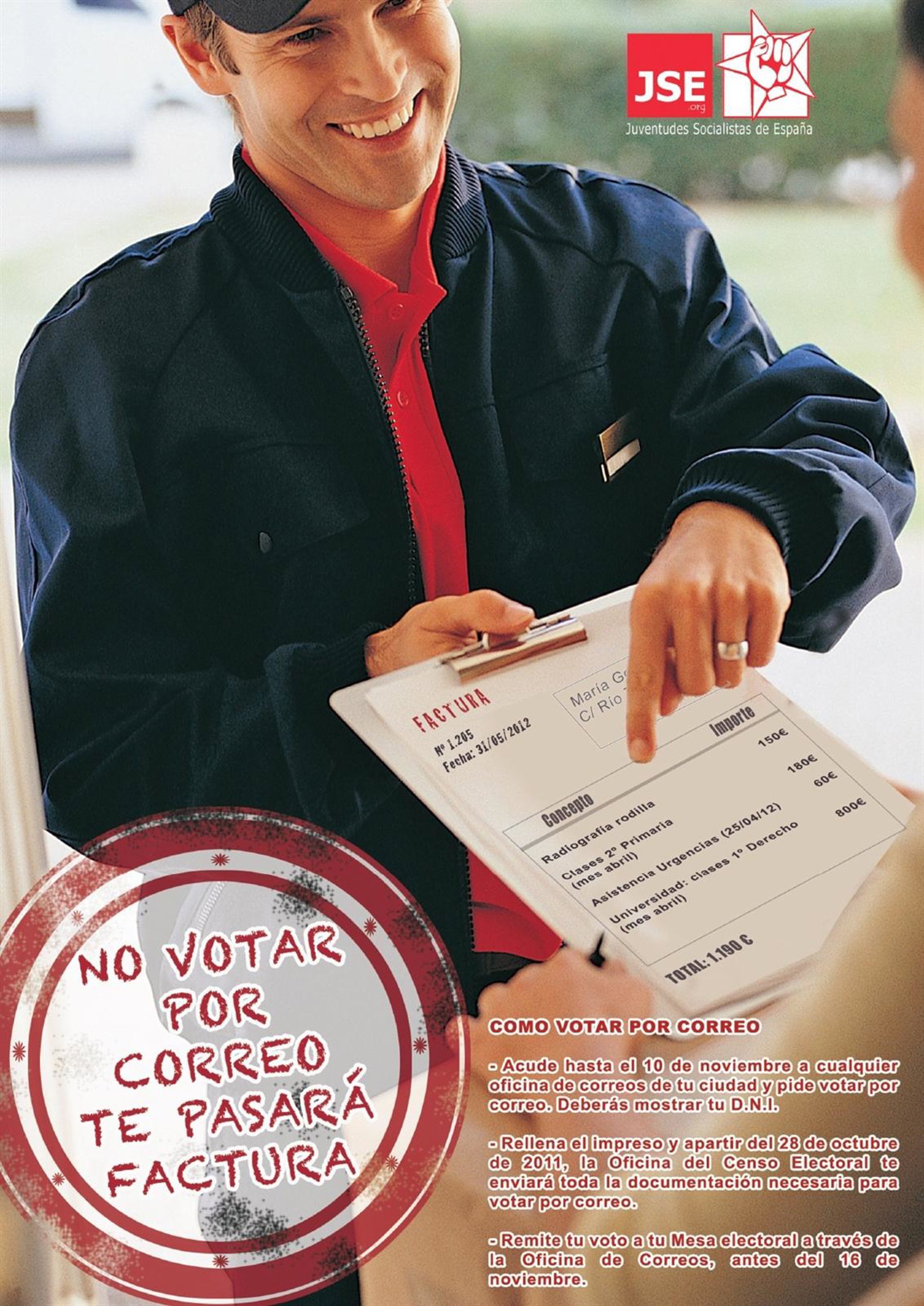 Juventudes Socialistas de España (JSE) ha lanzado una campaña para fomentar el voto por correo que lleva por lema 'No votar por correo te pasará factura' y con la que pretende recordar a los ciudadanos que "el copago sanitario y educativo" están asegurados si el PP vence en las elecciones del próximo 20 de noviembre.