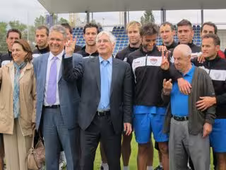 Su visita ha concluido con una foto de familia con los jugadores del Club Deportivo Guadalajara --y la cabeza de lista regional por la provincia, María Antonia Pérez León; la candidata a la Alcaldía del PSOE, Magdalena Valerio y la consejera de Educación, Ciencia y Cultura, María Ángeles García, que se ha llevado un 'balonazo' de Barreda-- donde ha propuesto hacer "la señal de la victoria", aunque el dirigente socialista ha querido precisar que ese gesto era para que el equipo de fútbol consiga el ascenso el domingo.