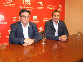 El secretario general del Partido Comunista de España (PCE), José Luis Centella junto al candidato de IU-Verdes a la presidencia de la Región de Murcia, José Antonio Pujante, ha declarado en Murcia la necesidad de "rebelarse".