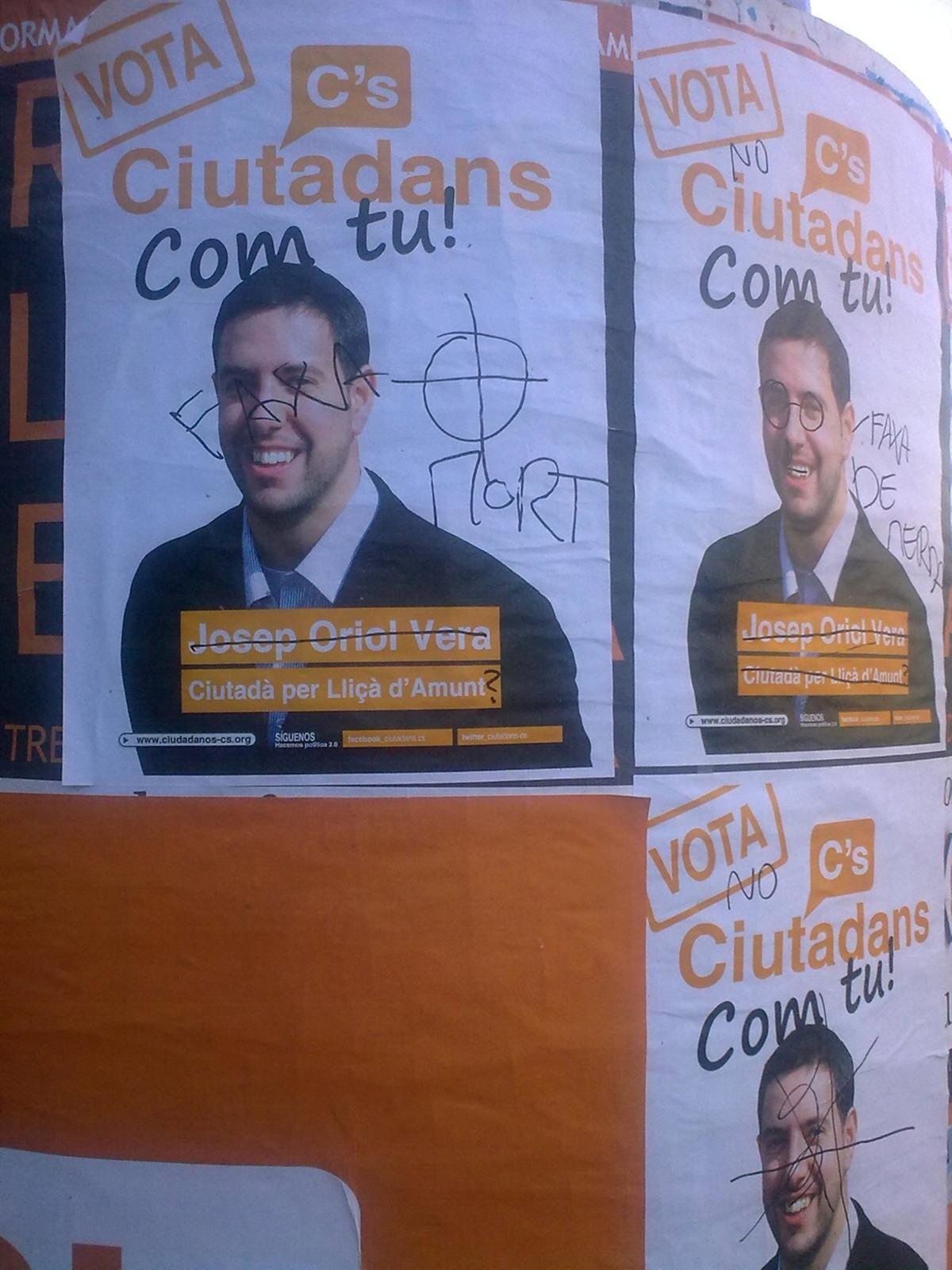 El alcaldable de C's en Lliçà d'Amunt (Barcelona), Josep Oriol Vera, ha denunciado ante la policía los insultos y amenazas de muerte que ha recibido a través de pintadas en unos carteles electorales.