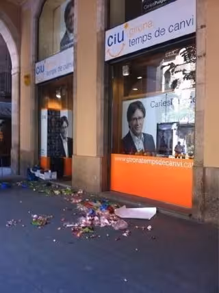Según CiU de Girona, tres jóvenes con la cara descubierta se han acercado a la sede electoral de la federación sobre las 12 del mediodía y han lanzado los restos de comida contra los cristales del establecimiento.