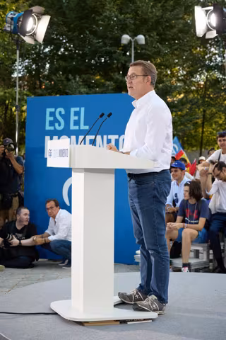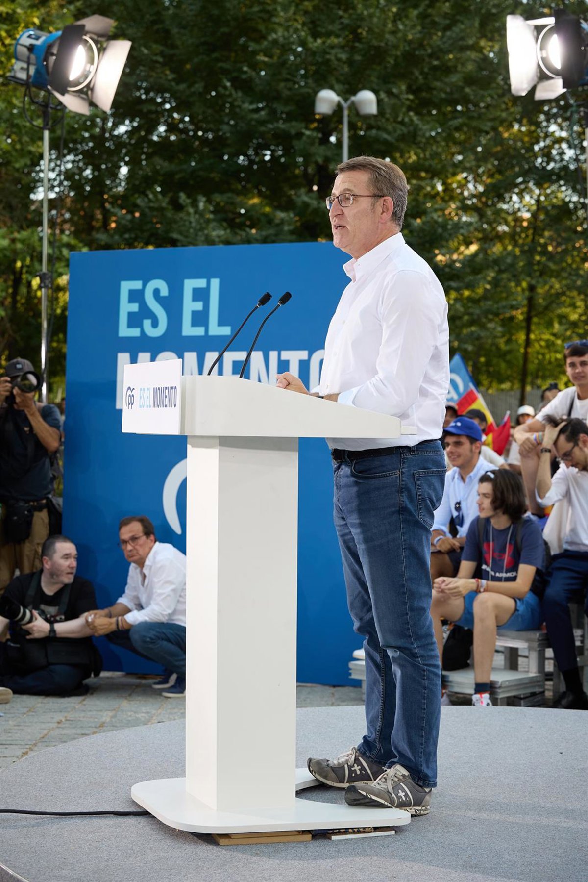 El líder del Partido Popular y candidato a la Presidencia del Gobierno, Alberto Núñez Feijóo, durante un acto de campaña electoral, en Puente del Rey, a 20 de julio de 2023, en Madrid (España). El Partido Popular ha celebrado este mitin de cara a las pr - Jesús Hellín - Europa Press