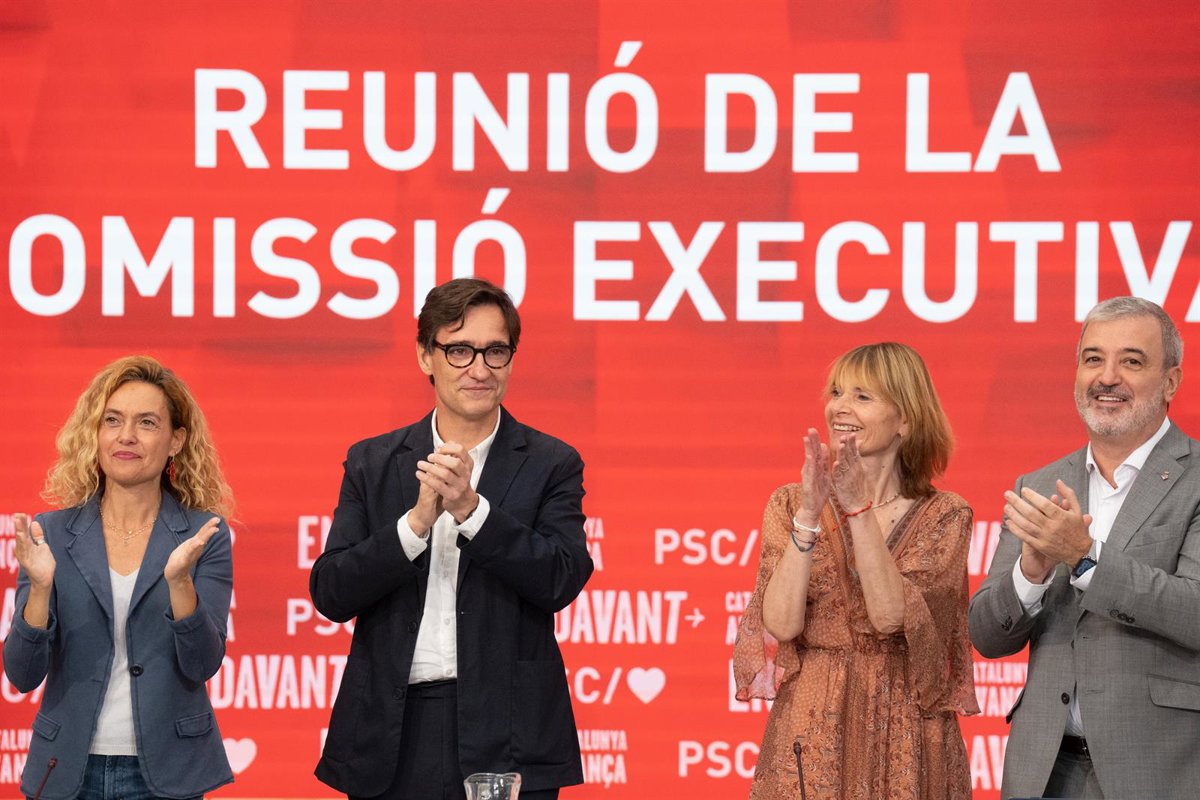 La cabeza de lista del PSC por Barcelona, Meritxell Batet; el primer secretario del PSC, Salvador Illa; la nueva presidenta de la Diputación de Barcelona, Lluïsa Moret, y el alcalde de Barcelona, Jaume Collboni, en la ejecutiva del PSC por el 23J - David Zorrakino - Europa Press