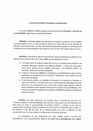 En declaraciones a los medios desde su sede, el candidato de C's a la Presidencia de la Generalitat, Albert Rivera, ha anunciado que su partido ha presentado un escrito ante la Junta Electoral Provincial para que impida "una celebración de una concentración ciudadana en apoyo a Artur Mas".