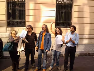 Los manifestantes, concentrados desde las 10 horas en la esquina del Paseo de Recoletos con la calle Prim, han acogido a los imputados con aplausos, gritos y una pancarta blanca, "que estaban reservando para este momento", en la que podía leerse 'Gracias por tener la valentía de buscar una sociedad mejor (...) incluso para los que se quedan en casa'.