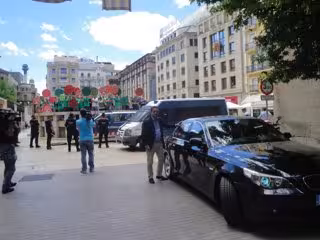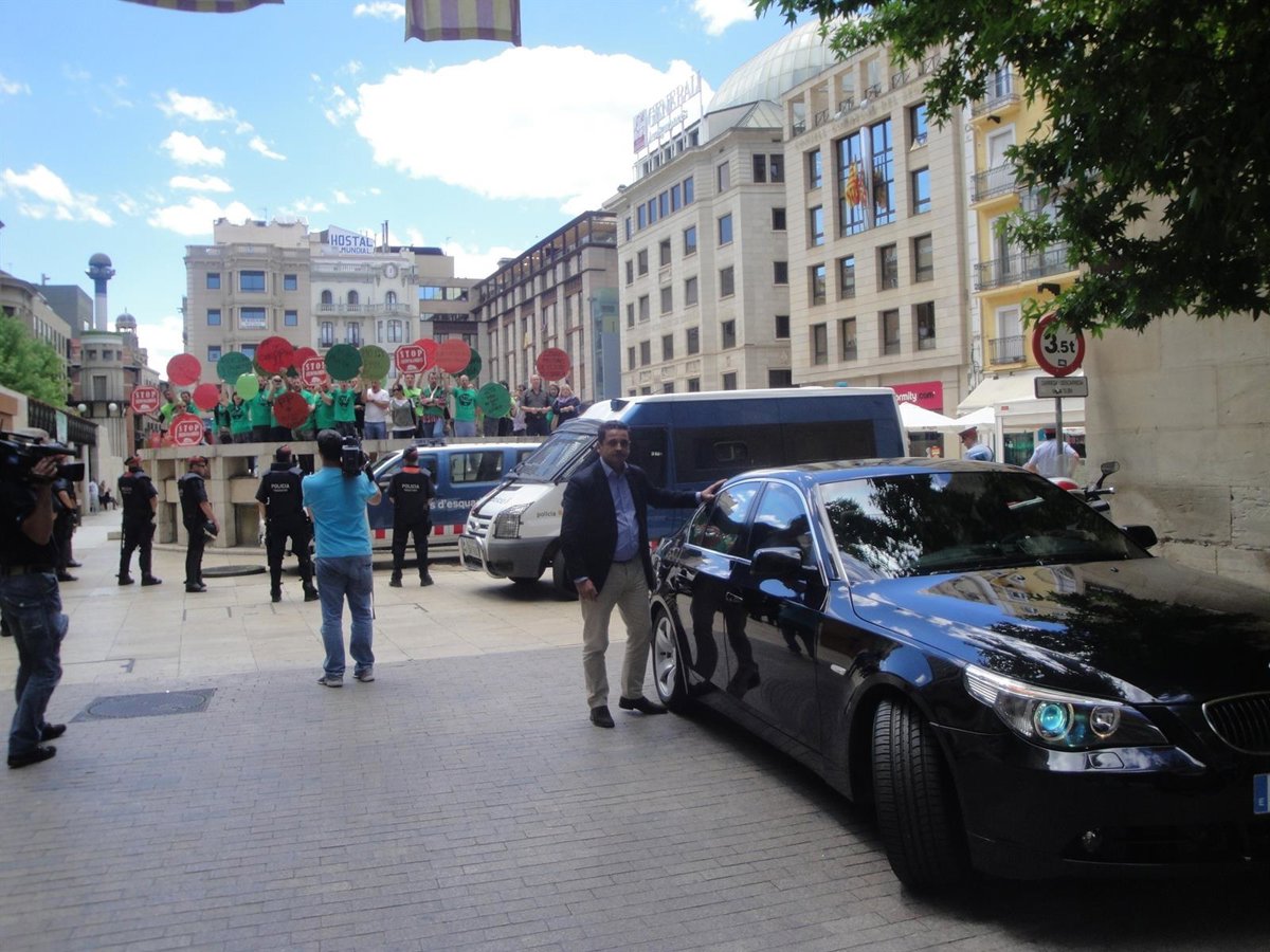 Tres furgonetas de Mossos d'Esquadra y una quincena aproximadamente de agentes uniformados han impedido a los activistas bajar de la plataforma de cemento de la plaza, mientras el ministro ha avanzado hacia su coche rodeado de su equipo de seguridad.