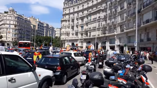 Desde la plaza Francesc Macià hasta la Delegación del Gobierno, llevan banderas españolas como capas u ondeando por las ventanas de los vehículos, además de hacer sonar sus bocinas, reproducir música militar y el himno español, y gritar proclamas, como 'País socialista, país tercermundista', mientras les han aplaudido algunos peatones desde las aceras.