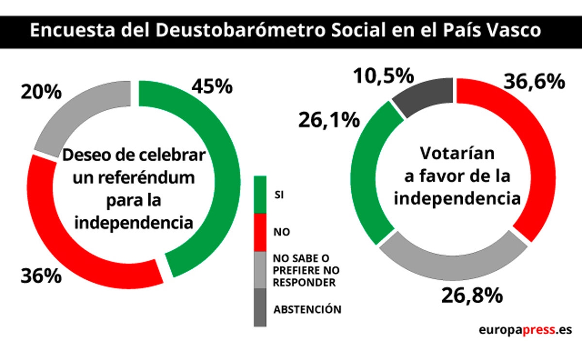 Un 45% de los vascos es partidario de la celebración de un referéndum sobre la independencia política en Euskadi, un punto más que hace un semestre, y 26,1% votaría a favor de la independencia si se celebrarse (3 puntos más que hace seis meses), mientras que un 36,6% lo haría en contra (5 puntos menos que en el semestre anterior), según los datos recogidos en la 11ª edición del Deustobarómetro Social, correspondiente a la oleada de invierno.