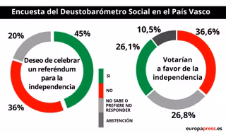 Según el sondeo, a un 45% de los entrevistados le gustaría que se celebrara un referéndum sobre la independencia política de Euskadi, frente a un 36% que no lo desea (3 puntos menos que hace seis meses) y un 20% no contesta al respecto.
