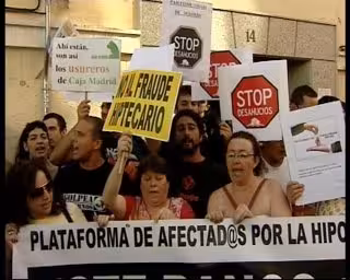 Un cartel en el que puede leer "Oficina cerrada porque la sociedad está despierta" ha sido colocado por los propios manifestantes a la entrada de la sucursal, a la que previamente se había dirigido el abogado, Rafael Mayoral, junto con el cabeza de familia, Anwar para presentar un escrito, en el que solicitan la condonación de la deuda contraída.
