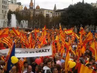 Por primera vez en Cataluña, la celebración de un 12 de octubre ha contado con este tipo de acto contra la independencia --'Cataluña somos todos', reza el emblema-- y que se ha desarrollado en un ambiente festivo, con ciudadanos que proclaman sentirse tan catalanes como españoles, abogan por la convivencia, portando banderas rojigualdas y 'senyeres', y alguna europea.