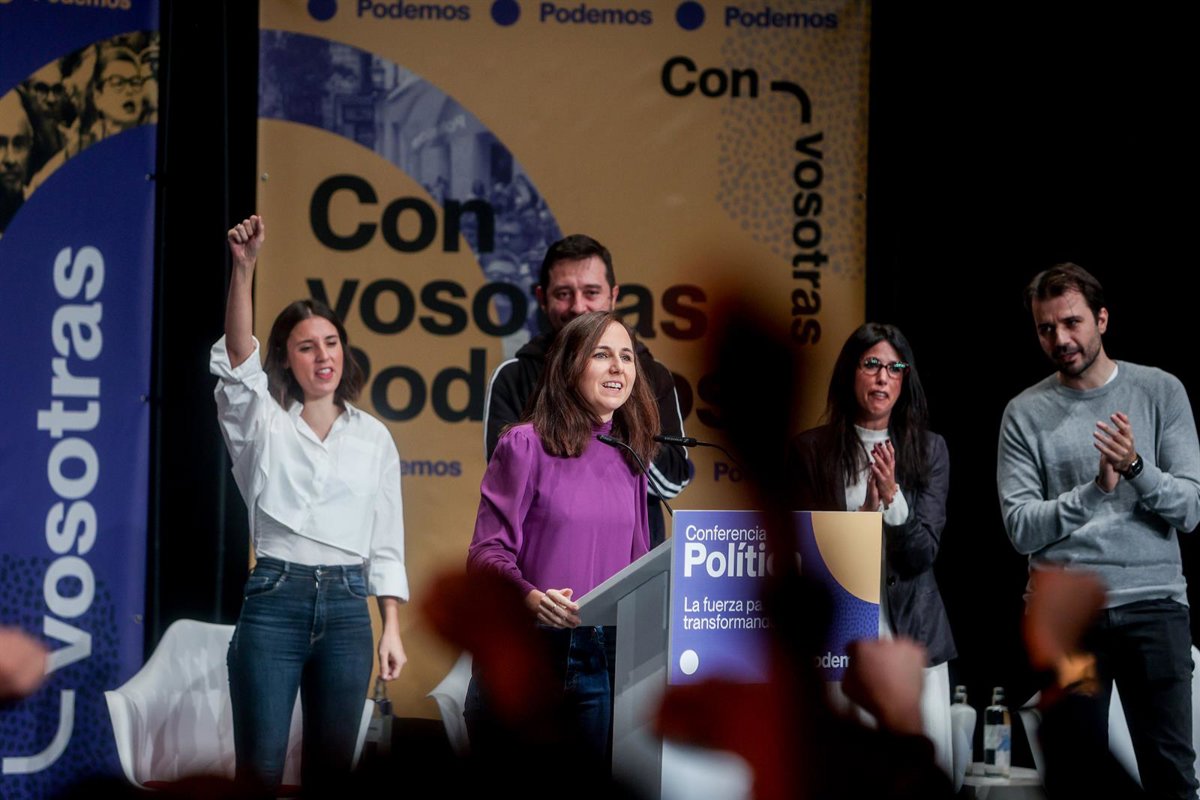 (I-D) La secretaria de Acción de Gobierno de Podemos y ministra de Igualdad en funciones, Irene Montero, el secretario de Horizonte Republicano de Podemos, Rafa Mayoral, la secretaria general de Podemos y ministra de Derechos Sociales y Agenda 2030 en fun - Ricardo Rubio - Europa Press