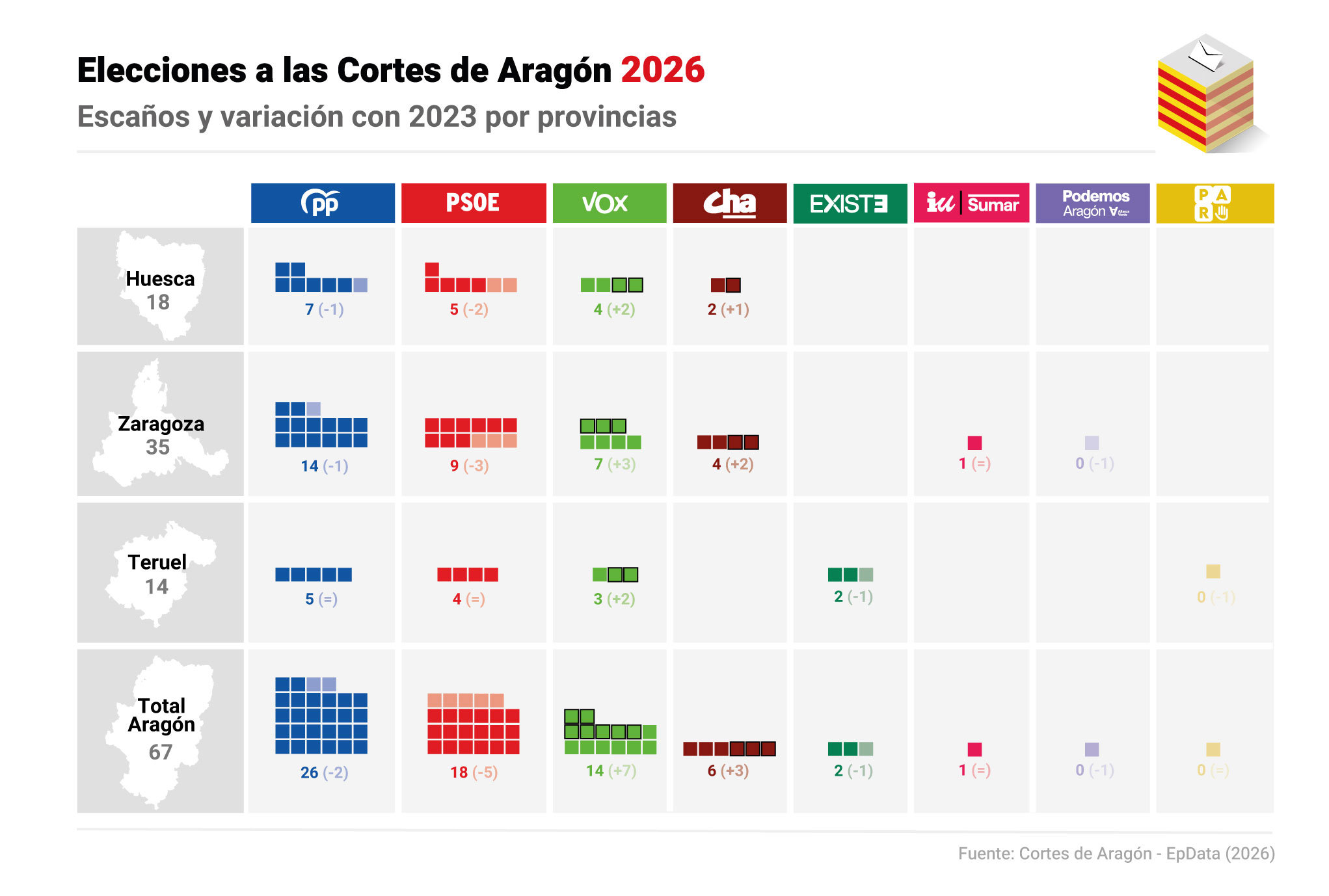 En los comicios de mayo de 2023, el PP consiguió 28 escaños (35,5%) con Azcón frente a los 23 del PSOE (29,55%), que entonces lideraba el fallecido Javier Lambán. A más distancia se situaron Vox, que obtuvo 7 diputados (11,2%); Chunta, con 3 escaños (5,10%) o Aragón Existe, que también logró 3 actas (4,95%). Izquierda Unida, Podemos y Partido Aragonés tuvieron cada uno de ellos un escaño.