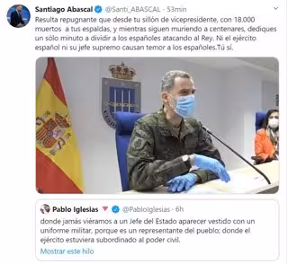 "Ni el ejército español ni su jefe supremo causan temor a los españoles. Tú sí", ha espetado Abascal a Iglesias acompañando el comentario de una fotografía de Felipe VI con mascarilla durante su visita al Mando de Operaciones desde donde se dirige la Operación Balmis de lucha contra el Covid-19.