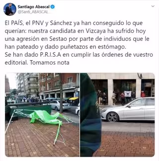 "El PAÍS, el PNV y Sánchez ya han conseguido lo que querían: nuestra candidata en Vizcaya ha sufrido hoy una agresión en Sestao por parte de individuos que le han pateado y dado puñetazos en estómago", ha denunciado Abascal en un comentario publicado en su cuenta de Twitter.