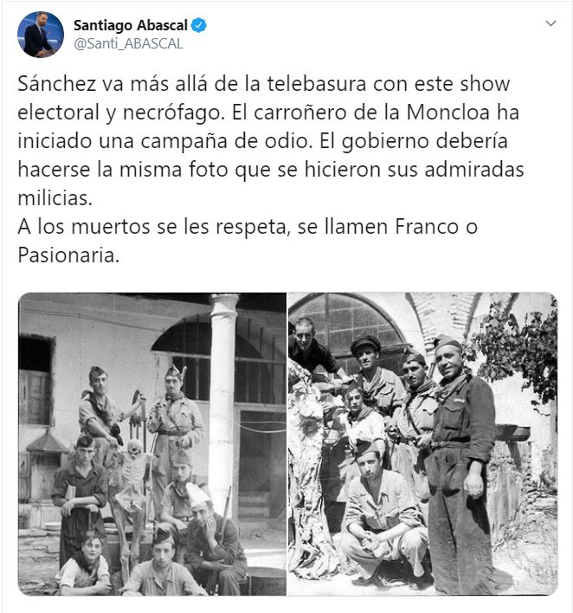 "El gobierno debería hacerse la misma foto que se hicieron sus admiradas milicias", ha propuesto Abascal en un comentario en Twitter que acompaña de dos fotografías en las que se puede ver a "milicianos" posando con muertos.