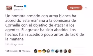 Los Mossos d'Esquadra han abatido este lunes a un hombre armado que ha entrado en una comisaría en el municipio de Cornellà (Barcelona), según ha informado el cuerpo policial en Twitter.