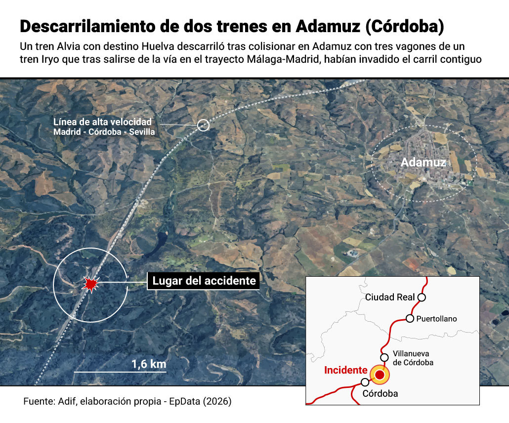 En el tren Iryo viajaban cerca de 300 personas, mientras que el Alvia transportaba alrededor de 200 pasajeros. El accidente se produjo en un tramo clave del eje ferroviario que conecta Madrid con Andalucía, lo que obligó a interrumpir la circulación de trenes de alta velocidad y larga distancia entre la capital y ciudades como Córdoba, Sevilla, Málaga y Huelva, con importantes afecciones para miles de viajeros.