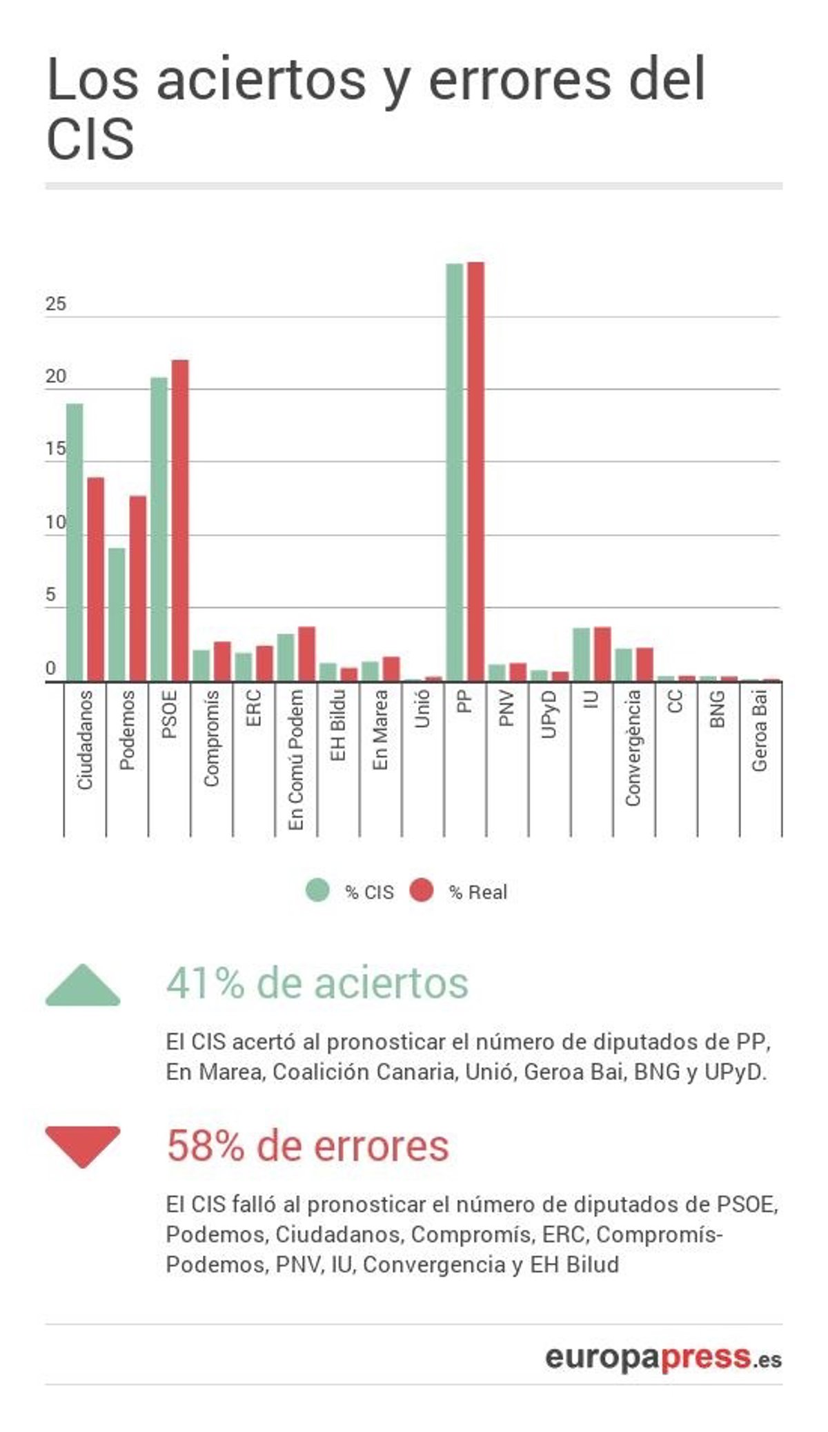 El estudio preelectoral del Centro de Investigaciones Sociológicas (CIS) acertó a la hora de pronosticar los resultados del PP en las elecciones generales de este domingo, pero falló al calcular el peso que iban a tener las fuerzas emergentes (Podemos y Ciudadanos) en el Parlamento.