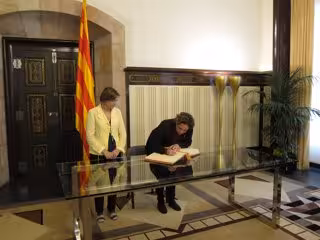 Tras la firma, la presidenta del Parlament le ha entregado un CD con el himno de Catalunya y una bandera catalana de una edición limitada de 1.000 ejemplares.