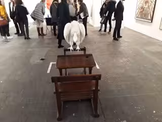 La galería Helga de Alvear expone en ARCOmadrid una obra del colectivo alemán Elmgreen & Dragset consistente en un antiguo pupitre de madera sobre el que se posa un amenazante buitre blanco.
