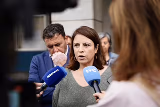 La delegada del Gobierno en Asturias, Adriana Lastra, atiende a los medios frente al Ayuntamiento de Laviana tras el asesinato de una mujer a manos de su marido de 90 años a 2 de julio de 2025, en Laviana, Asturias (España). - Juan Vega - Europa Press