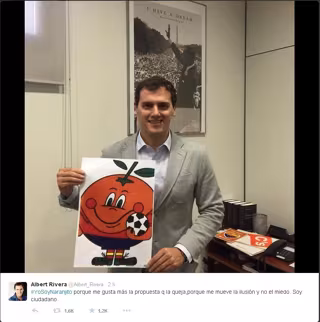 Además, el líder de C's ha recibido una ola de apoyo en la red social, donde el hashtag #YoSoyNaranjito se ha situado en segunda posición en los trending topics mundiales, mientras que en España ha llegado a ser el tema más comentado. En la fotografía, Rivera aparece sonriente, sosteniendo un cartel con un dibujo de Naranjito, y en la pared que hay tras él se ve un póster de Martin Luther King con la frase "I have a dream".